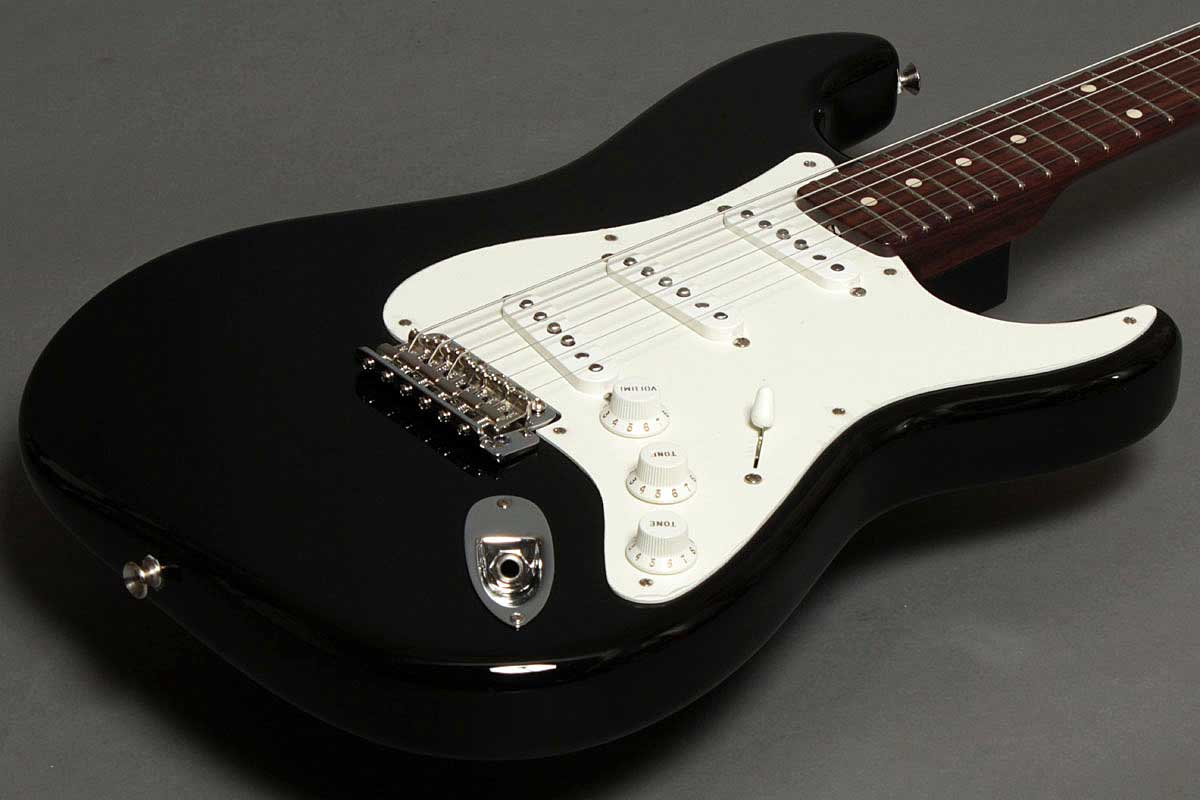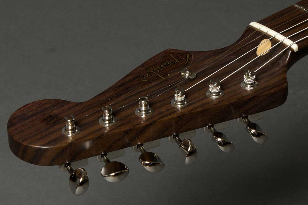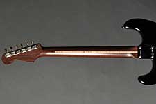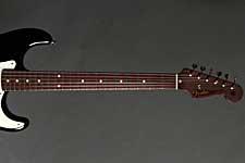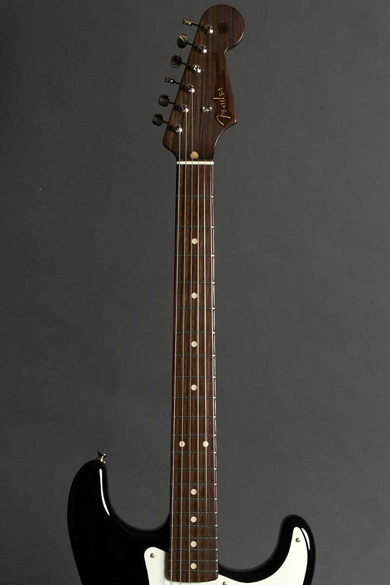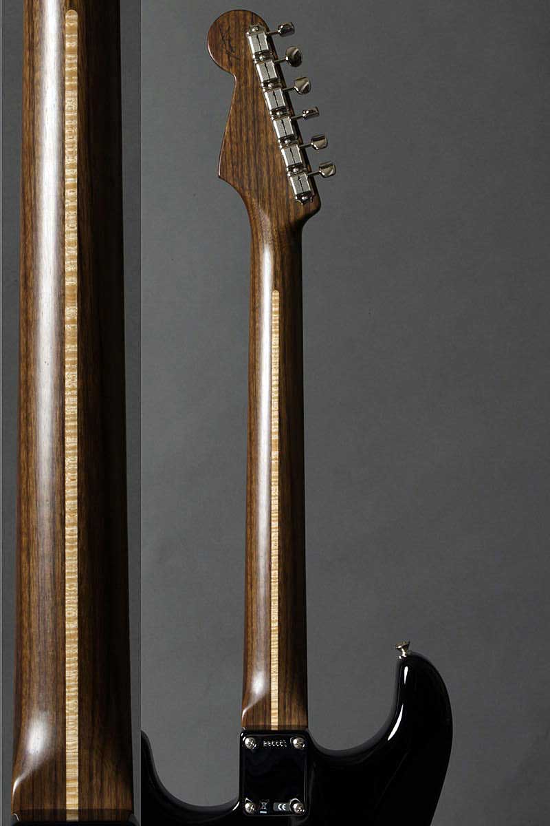 | ショップオーダーの1ピースローズウッドネックの57ストラト。 オリジナル1957年製のローズウッドネックストラトにはトラスロッドが入っていませんでしたが、このオーダーしたギターにはトラスロッドを入れネック調整を可能にしました。スカンクラインにはメイプルを採用しています。さりげなくフレイムメイプルを使ってるあたりがオシャレですね。 フィンガーボードのラジアスは9,5インチでフレットは6105を採用し、コレクターズアイテムとしてだけでなく、演奏性にも考慮しています。ピックアップはファット50sを搭載しています。 メイプルネックのストラトよりも芯のあるエッジの効いたサウンドはローズウッドネックならではです。 イーグルスのジョーウォルシュもローズウッドネックストラトがお気に入りのようで、クリスフレミングのものであったり、他社のコピーモデル(?)だったりします。 |