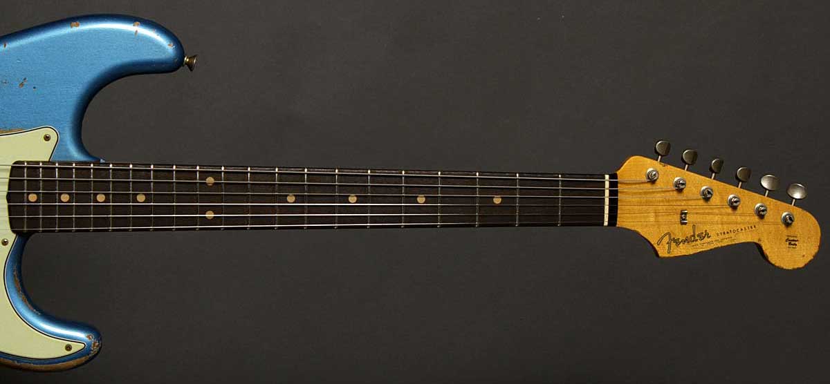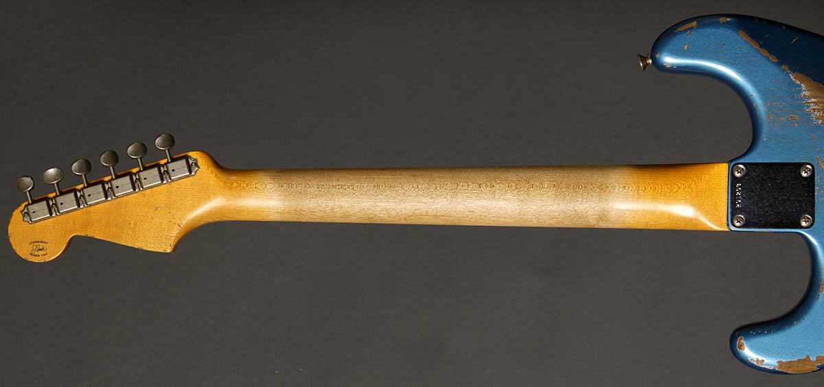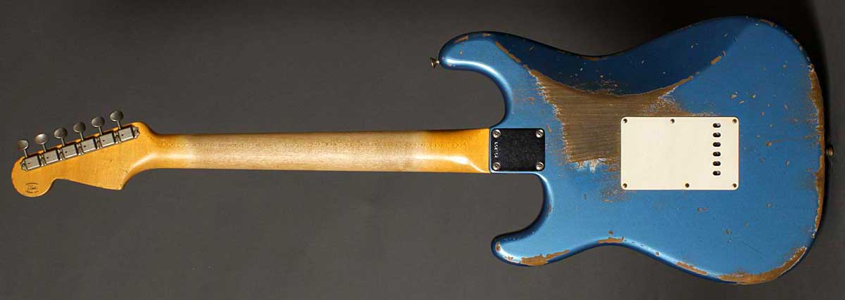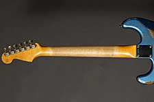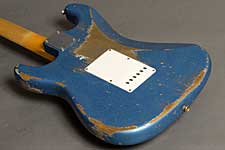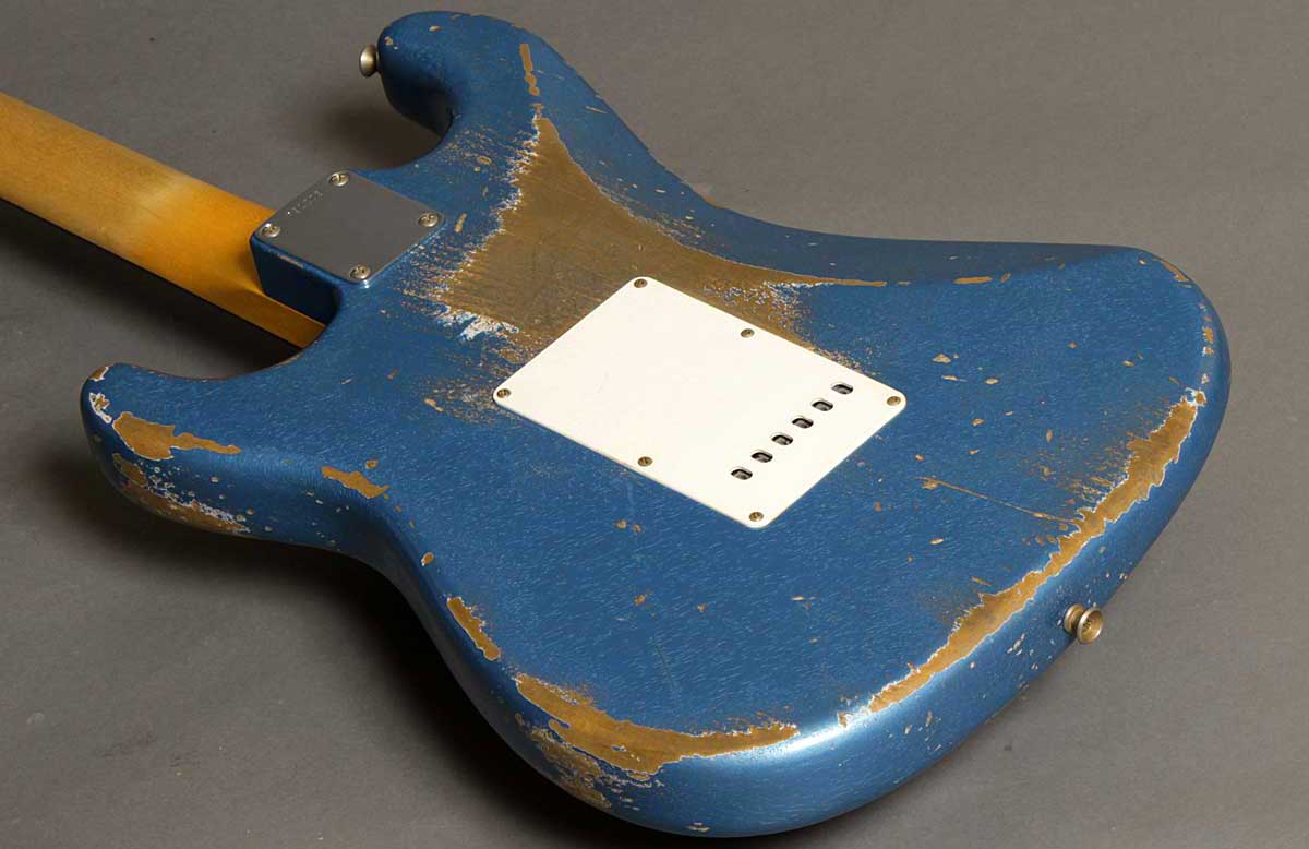 | ショップオーダーのジェイソンスミス製作の61ストラトヘヴィレリック。 軽量アルダーボディはベースサイドでの2ピースボディ。ネックには美しい柾目のメイプルを、指板にはダークカラーのローズウッドを使っています。 9,5インチラジアスの指板と6150フレット(ヴィンテージジャンボ)の組み合わせがスムーズなフィンガリングを約束します。6150フレットは6105よりも幅があり高さは低いタイプで、スライドさせた時にフレットのゴツゴツ感が抑えられます。ピックアップはファット50sを搭載しパワフルでありながらもスムーズなトーン。トーンコントロールはリアとセンターが共通のコントロールです。 ジェイソン渾身のヘヴィレリックは迫力あるルックス。まさに弾き込んだ歴史を再現しています。 |